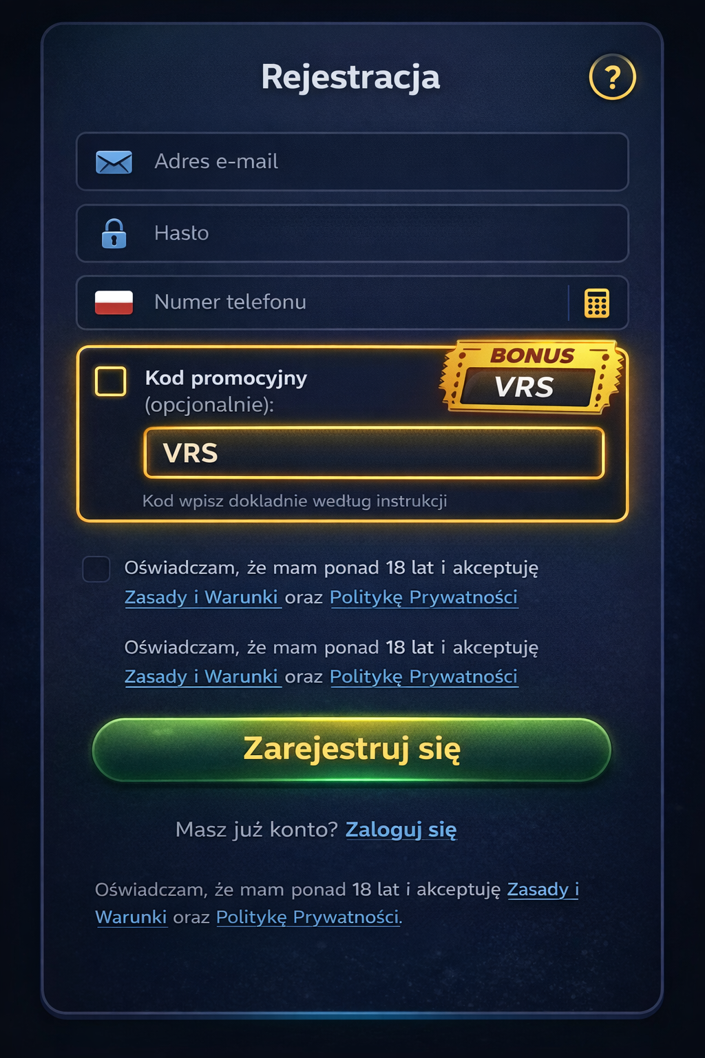 - Wpisz kod promocyjny (jeśli wymagany) – skopiuj kod (np. VRSCOOL) i wklej go w odpowiednie pole podczas rejestracji.