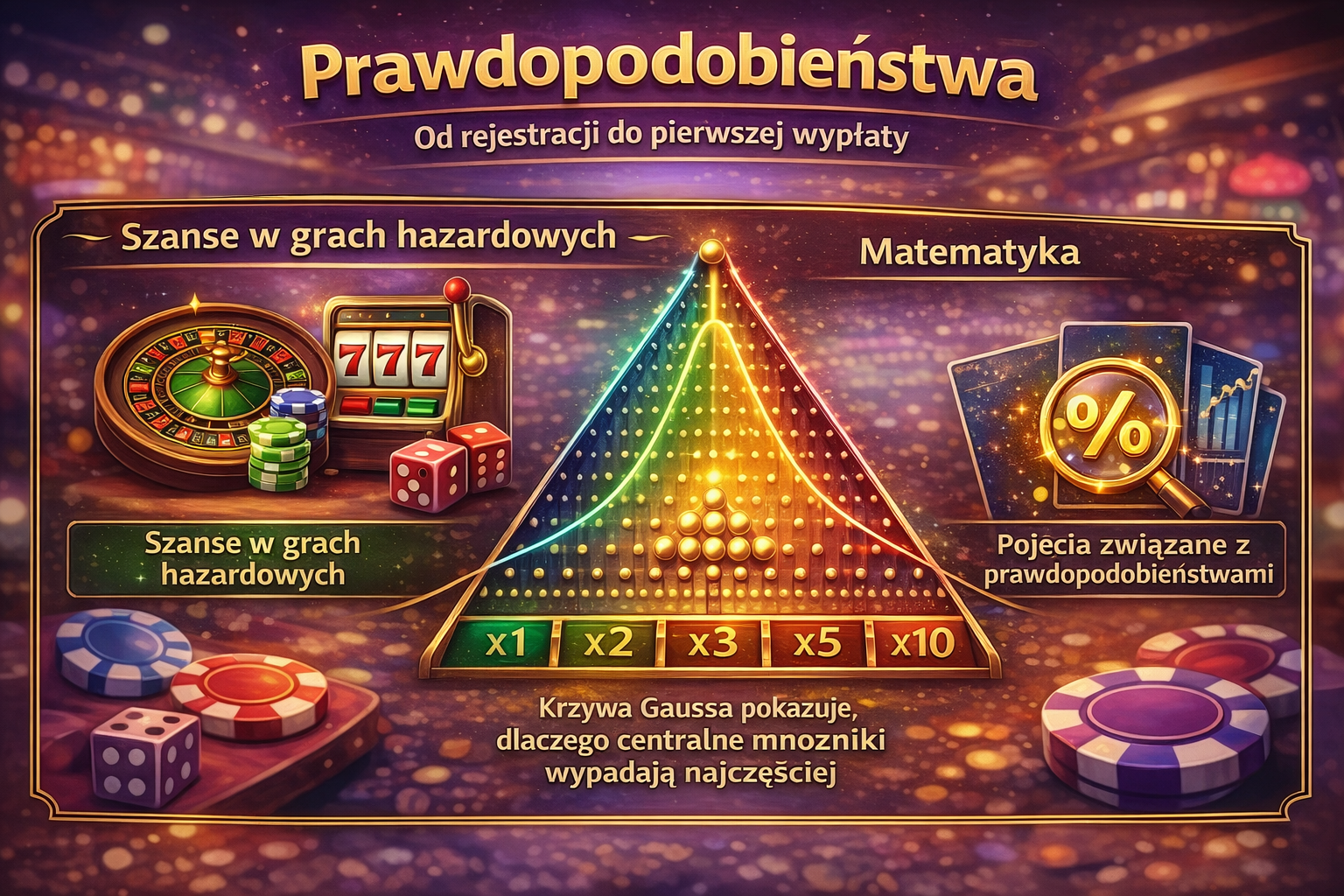 Jak działa rozkład prawdopodobieństwa: przy każdym kołku kulka ma 50% szans na odbicie w lewo i 50% w prawo — identycznie jak rzut monetą. Po 16 rzędach kołków (maksymalna konfiguracja) każda ze ścieżek prowadzi do jednego z 17 kubełków dolnych. Środkowe kubełki są statystycznie najbardziej prawdopodobnym miejscem lądowania (rozkład dzwonowy), skrajne kubełki są najrzadsze — ale niosą najwyższe mnożniki.